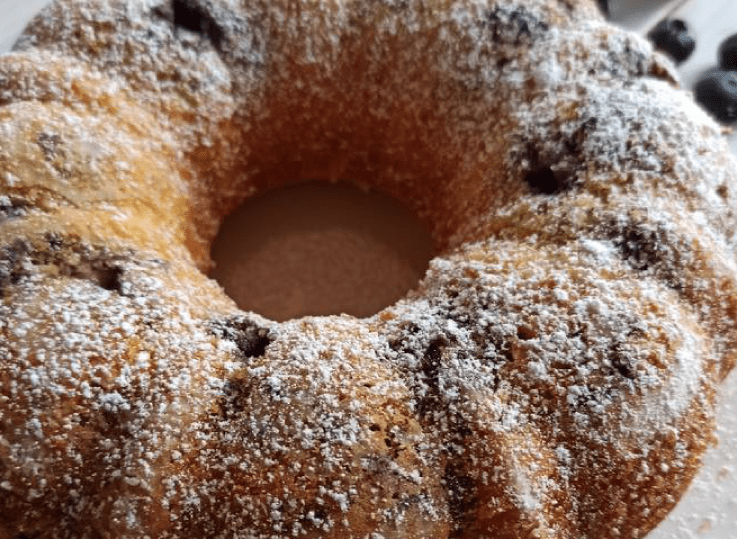 2. Versa l’impasto in uno stampo a ciambella, imburrato e cosparso con la polvere di biscotti.